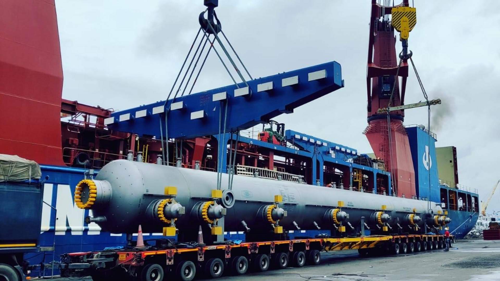 The two hydrolysers weigh 180 tons each and are 37 meters long. They were manufactured in India and shipped from Mumbai to Antwerp. They then continued their journey on inland waterways via the Rhine, Main and Danube rivers to their destination in Linz.