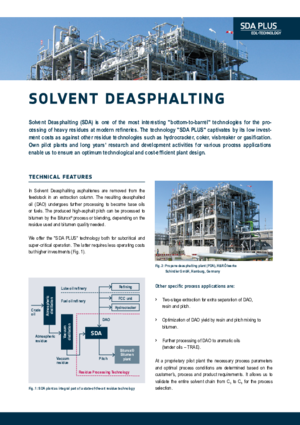 Solvent Deasphalting (SDA) is an innovative technology for deasphalting of heavy refinery residues through solvent extraction. It utilizes various solvents (ranging from C3 to C6 and their mixtures) in a single-stage or two-stage process.