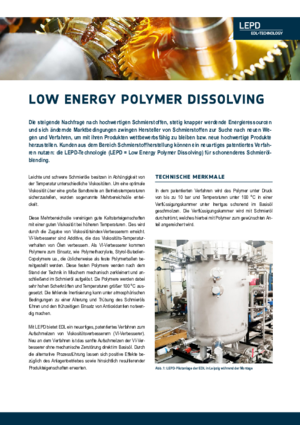 Mit der LEPD-Technologie bietet EDL ein neues Verfahren zum sanften Aufschmelzen von Viskositätsindex-Verbesserern ohne mechanische Zerstörung direkt im Basisöl. Durch die alternative Prozessführung lassen sich positive Effekte beim Anlagenbetrieb sowie im Hinblick auf resultierende Produkteigenschaften erwarten.